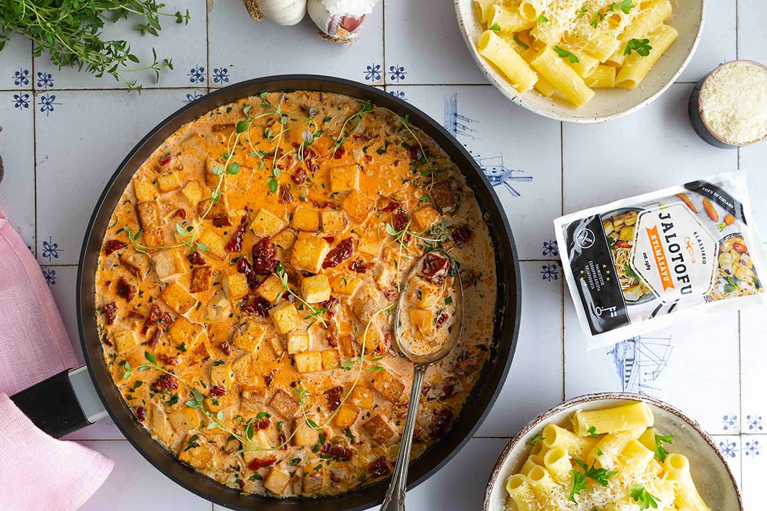 Pikainen tofu-pannupasta on myös täydellinen arkiruoka, kun haluat jotain nopeaa, helppoa ja todella hyvää. Rapea savutofu paistetaan ensin pannulla, jonka jälkeen samaan pannuun lisätään makaronit, tomaatit, mausteet, tuorejuusto ja vesi. Kansi kiinni ja pasta hautuu valmiiksi vain noin 15 minuutissa.